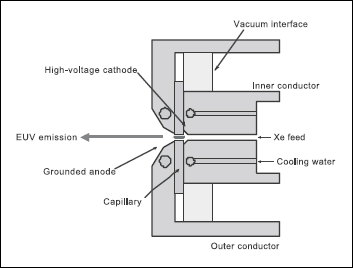Fig.1 shows conceptual cross section of the discharge head. The head basically consists of a set of anode, insulator and cathode. A coaxial conductor feeds the pulsed electrical energy from the generator into the head. Both electrodes are cooled by circulated water. The source head was designed to minimize the circuit inductance, maximize collection angle of EUV radiation, and increase thermal resistance from the electrical current and the plasma. As already known, EUV radiation is collected by a collector and focused on the intermediate focus (IF), which is an interface between the source and exposure tool. EUV source is required to obtain sufficient EUV power at IF. IF power is determined by the radiation power from the plasma (source power), absorption by gases and debris shields, and collection efficiency. Collection efficiency is a function of collector performance and plasma shape11.