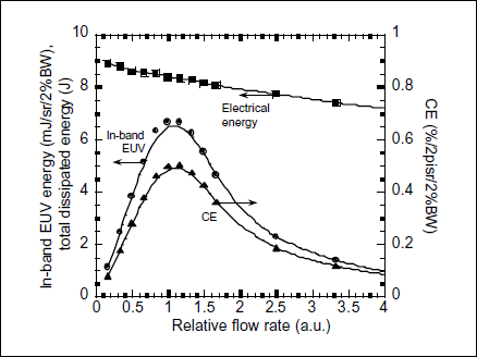 Fig.3 shows dissipated energy, in-band radiated energy, and conversion efficiency as a function of gas flow rate. Each point represents averaged data. At the optimum condition, highest EUV energy of 6.7 mJ/sr/2%BW was obtained. Z-pinch plasma is created due to the inward compression by the magnetic pressure. In Xe plasma, in-band EUV (λ=13.5nm) emission is radiated only by Xe10+ ions of which the fraction depends on the plasma temperature and density. Fig.3 showed that variation of initial density (flow rate) resulted in the variation of plasma parameter and resultant fraction of Xe10+ ions for given power supply and electrode geometry.