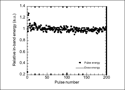 Fig.4 shows pulse and dose energy integrated over 50pulses measured at 7kHz. Since higher flow rate described above was used, first several pulses do not have enough energy. However, the energy rapidly reached average level, then remained stable. There are possible reasons to make energy stability worse, for example, gas dynamics, MHD instability during implosion phase, inhomogeneity of initial plasma fill. In our research, we employed increased gas flow, short current duration and large current amplitude, active preionizing to eliminate the seed of energy instability mentioned above. At this moment, 4.3mJ/sr/2%BW/pulse was obtained even at 7 kHz. It equals to the source power of 189 W/2%BW into 2πsr. Having the source power and shape of the plasma, IF power reached 19W/2%BW.