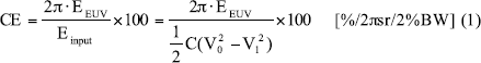 where EEUV, Einput, V0, V1 are on-axis in-band energy per unit solid angle, electrical energy input, initial capacitor voltage and capacitor voltage reversal after the current pulse, respectively. In this equation, uniform radiation into half spherical volume is assumed. Energy input is based on capacitor energy, and includes ohmic and magnetic energy loss between the capacitor and discharge head. Note that intrinsic CE determined by dissipated energy in the discharge head is much higher than the value calculated here. Gas absorption is not considered here.