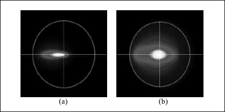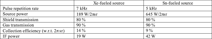 Fig. 10 shows the picture of in-band-emitting tin plasma taken by an in-band pinhole camera with 200pulses of exposure. Because the shape of the plasma was not optimized at the time of the experiment, in -band radiation emitted from a relatively large surface of the plasma. However, owing to the good performance of the discharge head and tin delivery, the shape is still good although it is a time -integrated picture. Having this plasma picture, collector performance and absorption by gas and debris -shield, it was derived that IF power reached 42W into 3.3mm2 sr.