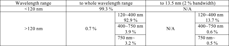 Table 1 shows the result of OoB energy measurement. Calorimeter was placed at IF point and energies of each wavelength region were measured by changing a filter in front of the detector. It is very interesting that most radiation energy is in the wavelength region of <120nm. This result was well explained by the plasma average temperature. Z-pinch plasma is changing its density and temperature in time. However, temperature averaged over a discharge period (several hundreds of ns toµs) would be on the order of tens of eV. Such a plasma emits radiation of mostly less than 130nm as derived by Planck's equation.