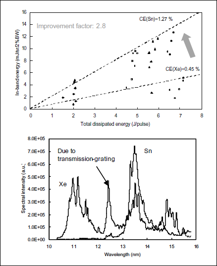 For the demonstration of high CE of tin, EUV energy and spectrum were measured. Fig.7 shows the comparison of in- band EUV energy (a) and spectrum (b), respectively. Note that the spike seen in the spectrum at wavelength of about 12.4nm is a calculation error. Spectrum was measured with a transmission-grating spectrometer in which the grating is made of silicon nitride. Thus the absorption edge of silicon appeared in the spectrum, which resulted in the spike when the diffraction efficiency was numerically corrected. It is clearly understood, from Fig.7, that stannane-fueled Z-pinch improved CE by a factor of 2.8 than xenon. This high CE is explained by high spectral efficiency (in-band domination in the emission spectrum) seen in Fig.7(b). As described in 3.1, xenon-fueled Z-pinch obtained sufficient radiation stability. Although the radiation energy can be adjusted by means of feedback control, certain level of stability must be obtained even without feedback. Pulsed power generator provides excellent output stability. Therefore gas flow condition and plasma hydrodynamics are essential for the radiation stability.