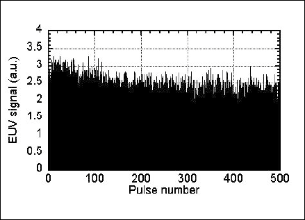 Fig.8 shows an example of EUV signal measured at 1 kHz on stannane-fueled Z-pinch source. Due to wellcontrolled stannane flow, as sufficient rediation stability as xenon-fueled source was obtained even at high pulse repetition rate.