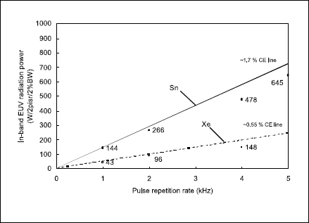 Fig.9. In-band radiation power from source plasma measured with xenon and stannane.
