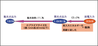 現在、スタナンを用いた固定単一対電極型DPPで、発光点出力700Wを得て、コレクタを設置した集光点出力特性(SoCoMo)の評価実験に入っている。目標の50Wが得られれば、EUV光源としてのこれまで最高出力となる。並行して、量産用DPPの実現に向け、レーザ融合型回転電極DPPの開発に着手し、既に、有望な結果を得ている。