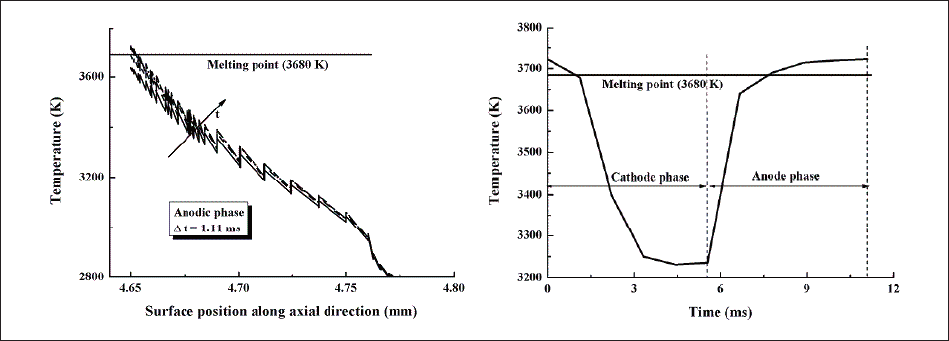 Time-dependent solution of the mercury lamp has been done for an operating frequency of 90 Hz with a peak value of the current as 1.4 A. Temperature distributions at the electrode surface for anodic mode (top) and temporal change of electrode-tip’s maximum temperature for a cycle of operation (bottom) are presented in Fig.2. During the cycle of operation, temperature change has been profound near the tip surfaces, mainly in the regions through which current flows, but it is not significant in the regions away from the tip surface. Figure in the top presents the temperature of all nodal points in the electrode periphery for particular axial positions and it can be realized that temperature in axial cross-sections of the electrode, especially near the tip, is not the same or temperature does not have rotational symmetry even inside the metallic body. The figure in the bottom implies that temperatures are above the melting point in a couple of micrometers from the tip surface around the end of anodic mode and at the very beginning of cathodic mode. Current flow through the constricted region of the electrode tips is the primary reason for such very high temperatures around the tip surfaces. If current-flow can be made diffused over electrode surfaces, electrode temperature can be controlled to withstanding limit.