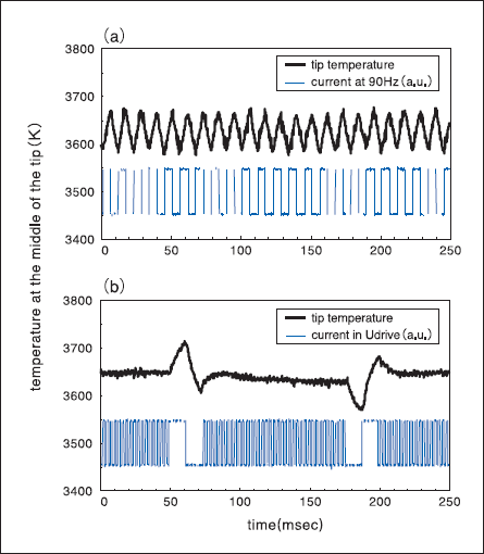 "Udrive", in which one cycle of lower frequency wave is inserted in relatively higher frequency waves, has been developed to maintain only one preferable shaped tip at the front end of the electrode. The beginning polarity of lower frequency wave is alternated at each insertion in order to adjust each electrode equally. "Udrive" takes advantages of both higher frequency and lower frequency. The higher frequency prevents the electrode temperature from becoming too low and/or high. Figure 1 shows that the temperature at the middle of the tip hardly changes at 360Hz, while it changes about 100K at 90Hz. The lower frequency has excellent function as an adjuster of the tip shape.