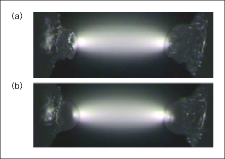 Fig.2 : Photographs of the tip at the front end of the electrodes in same lamp operated with different current waveform;