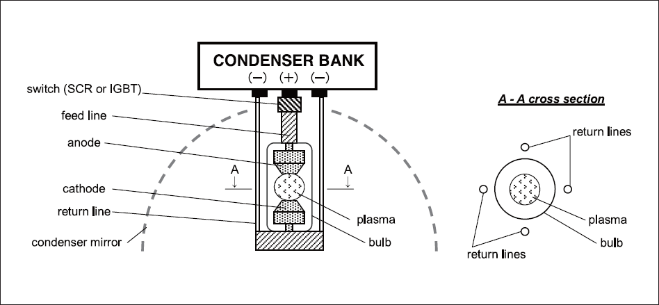 We developed a new type of electrode stabilized Xe filled flush lamp, called the UBF (Ushio boxer flush) lamp, operated at extremely high peak current. Fig.1 is a schematic of the UBF lamp and its drive circuit.Since impedance across the lamp is very low (order of 101 mΩ), impedance of the drive circuit should be as low as lamp impedance in order to transfer the stored energy to the lamp efficiently[2]. The feed line from the condenser to the lamp anode and return lines from the lamp cathode to the condenser consist a "co-axial feed", and the inductance of the feed lines is as low asabout 100nH. The low impedance circuit allows low voltage operation to obtain extremely high peak current The flush pulse is triggered by a SCR or an IGBT, and the peak current of hundreds MA/m2can be obtained with the drive voltage of several hundred volts. This means high repetition rate operation can be easily realized with reliable semiconductor switches. The UBF lamp is operated with DC simmer current, which dramatically reduces electrode damage. Sophisticated cathode designengages stable simmer and the pulse discharge position.
