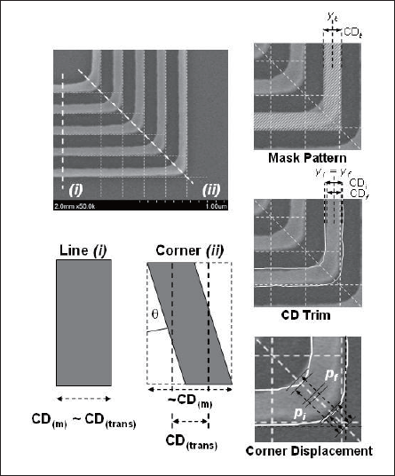 Fig. 5 details the top-down SEM methodology used to infer corner displacement arising from corner bowing. Along a diagonal cut line (ii), corner displacement due to shrinkage can be estimated from the inner and outer corner positions of elbows referenced to the corner position of the original pre-stabilized resist pattern. In order to generate the positional reference, we extrapolate pre-shrink line contours to yield a point on the diagonal cut-line that corresponds to the idealized outer mask elbow corner. ΔCD for lines far from the corner (cut line (i), for instance) can be determined for all stabilization conditions. Since trimming occurs equally on both line edges, ΔCD can be used to recover the original pre-stabilization reference location for trimmed patterns. Position and displacement of both inner and outer elbow corners can thus be determined consistently for all stabilization conditions. Other geometric approaches are equally valid; the method used here proved convenient given readily available image line-edge analysis software[22].