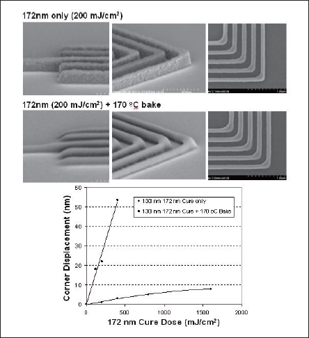 For insufficient 172nm doses, the resist is not sufficiently stabilized to developer and can undergo swelling or dissolution, and is also susceptible to reflow during the stabilizing bake. Fig. 8 demonstrates that both line-end tilt and corner bowing can be drastically more pronounced in the presence of resist reflow. Post-development reflow bakes have been evaluated as methods for smoothing line edge roughness[23,24]: results shown in fig. 8 suggest care must be taken if these methods are used for complex resist patterns.