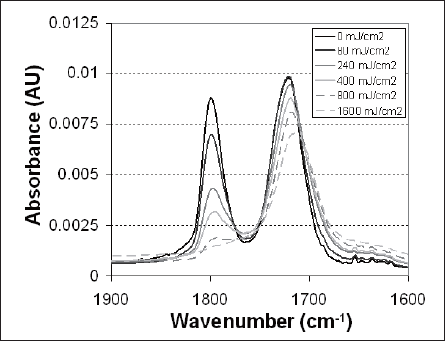 Fig.10:FT-IR monitoring of resist decarboxylation during 172nm stabilization. The peak at 1720 cm-1 represents linear esters in the resist; the peak at 1800 cm-1 represents an alicyclic lactone.