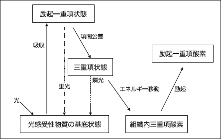 また、光感受性物質が励起一重項状態から項間交差を経て励起三重項状態となり、さらに励起三重項状態から基底状態へ戻る間に、生体内の溶存酸素にエネルギーを転換したり、光酸素化反応を経て生成したフリーラジカル種が溶存酸素と反応したりして、活性酸素種であるヒドロキシラジカル、一重項酸素、過酸化水素、スーパーオキシドなどを生成し、癌細胞に傷害を与える。この原理に基づいた治療方法がPDTである [3]