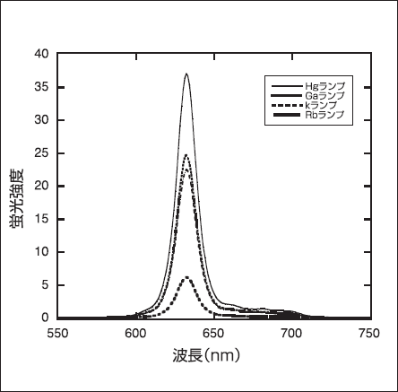 PDD用放電ランプは、5-ALAの誘導体であるPpIXの吸収スペクトルに合わせ、波長400~450nm付近の強いスペクトルを放射できるように、水銀と金属ハロゲン化物、すなわちョウ化ガリウム、ョウ化カリウムあるいはョウ化ルビジウムをバルブ内に封入した。また、水銀のみ封入したランプも作製した。また、PDT用放電ランプでは、630nm付近の吸収スペクトルに合わせ、バルブ中に水銀と金属ハロゲン化物、すなわちョウ化ナトリウム、ョウ化リチウム、ョウ化カリウム、ョウ化ルビジウムあるいはョウ化ナトリウムとョウ化リチウムの混合物を添加したランプを作製した。