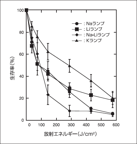 作製した放電ランプを用いて、PDDにおいては、プロトポルフイリンIxの蛍光発光強度の評価実験を行い、 PDTにおいては、ALAを用いた癌細胞のin vitroにおける殺細胞実験を行った。その結果を図3および図4に示す。PDD用放電ランプでは、図3から明らかなように、 Hgランプが最も高い蛍光発光能を示した [15]。次にPDT 用放電ランプでは、図4の通り、Na-Liランプが最も高い殺癌細胞効果を示した [16]