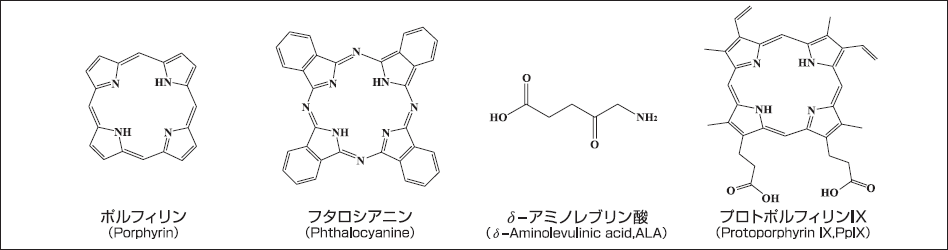 光増感作用を有する化合物は多数あるが、安全性を考慮して生体内に投与できるものは少ない。PDTに多用されている光増感性物質の一つにポルフィリン系化合物(図1)がある。ポルフィリン系化合物は、四つのピロール環がメチン基(-CH=)で結合された環状化合物(テトラピロール環)で、植物界ではクロロフィルに代表され、動物界では赤血球中の酸素を運ぶへモグロビンの基本骨格となっている。ポルフィリン系化合物は、共役系∏電子の非局在化に伴い可視光領域に強い吸収を持っている。またポルフィリン系化合物以外にも、還元ピロール環を一つ有するクロリン系化合物、二つの向かい合う還元ピロール環を有するバクテリオクロリン系化合物、あるいは合成ポルフィリンとしてフタロシアニン系化合物(図1)などがPDT用光増感性物質として利用されている。