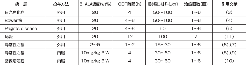 腫瘍性病変では、親水性軟膏を用いて調製した 20wt%ALA外用薬を病変部に塗布する方法が主に用いられている。光照射4時間前に病巣部に20wt%5-ALA外用薬を塗布し、ODTを行い、50〜100J/cm2で光照射を行う。
