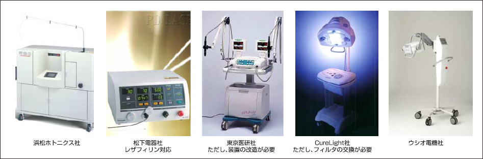 上述の通り、現在、PDT用として薬事認可を取得したランプ光源装置はない。そのため、美容機器などとして上市された光源装置をPDTに流用する場合が多い。しかし薬事認可を受けていない光源装置の中には、PDT に適切な波長ではないもの、照射均一度が低いもの、回路や素子の熱処理が施されていないもの、ノイズ処理が成されていないものなどが見受けられ、トラブルの発生が危惧される。少なくとも薬事認可された光源装置を使用すべきである。