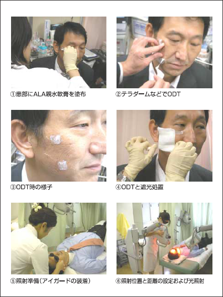 外用ALAを用いたPDTの一連の流れを図4に示す。光照射前にALAを添加した親水軟膏を患部に塗布し ((①))、Tegaderm®などでODT(occlusive dressing technique)を施し(②および③)、患部を遮光しながら所定時間ALAを塗布する(④)。さらに、アイガードで眼を保護しながら(⑤)、所定のエネルギーの光を照射する(⑥)。ここで、ALAの投与量、投与方法、ODT時間、照射エネルギーおよび照射回数は疾患によって異なる。種々の疾患に対する実績値を表1示す。