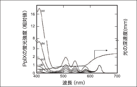 一般にPDTでは波長600〜800nmの赤色光が用いられている。一方、PpIXの吸光スペクトル(図2)を見てみると、410nmに吸光係数が大きい吸収ビーク(Soret帯)があり、他に510、545、580およぴ60nmに小さいピーク (Q帯)がある。このことは、PpIXの光励起には波長 400nm付近の青色光が有利であることを示す。しかし図3に示すとおり、長波長の光の方が皮膚組織中への深達度が大きい。また、波長600nm付近の励起光は深度の大きい皮膚組織中に存在するPpIXを効率良く光励起することができる[16]。換言すれば、表在性の皮膚疾患に対しては波長400nm付近の光が有効であり、深部の疾患には対しては600nm付近の光が有効である[17]