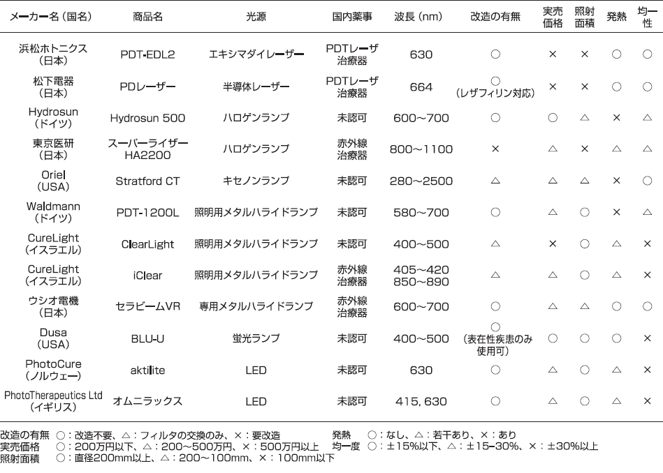 現在PDT用として厚生労働省の認可を受けているランプ光源装置はない。欧州では、ハロゲンランプ、キセノンランプ、照明用メタルハライドランプ、蛍光ランプ、 LEDなどがPDT用ランプ光源装置として上市されている[23-25]。また本邦でも、赤外線治療器として薬事認可された治療器がPDTに流用されている。