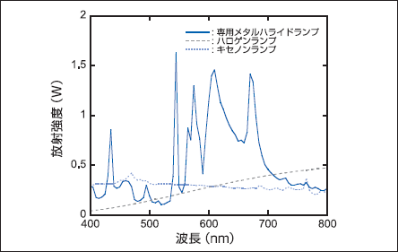 図6. 電力150Wのキセノンランプ、ハロゲンランプおよび専用メタルランプの放射スペクトル