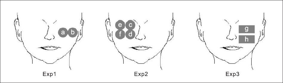 上記外用薬と照射装置を用いて以下の三つの実験を行った。各実験の実験部位および実験条件を、それぞれ図2および表1に示す。