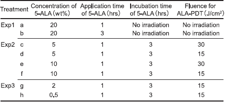 従来、尋常性ざ瘡に対する外用ALA-PDTのプロトコールでは、塗布時間が3-4時間であったが、今回の実験から、塗布時間が1時間であっても3時間であっても、蛍光発現の程度に明らかな差が見られなかった。したがって、塗布時間を1時間に短縮しても、組織内のポルフィリンの集積に影響がないことがわかった。