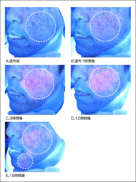 書面にて同意を得た34、43および44歳の健常男性被験者3名の頰部に20wt%5-ALA外用薬を塗布してプラスチックフィルムとガーゼで密封し、1時間後(図2a)あるいは3時間後(図2b)にふきとった。さらに、頬部に塗布してから12時間後に下顎部にも同様に外用した。塗布開始から 1、3、12および18時間後のポルフィリン系化合物の集積状態を画像診断装置にて蛍光観察した。また、塗布して1、 3、9および16日後の皮膚の状態を目視で観察した。