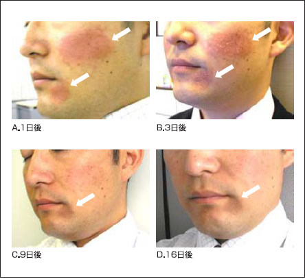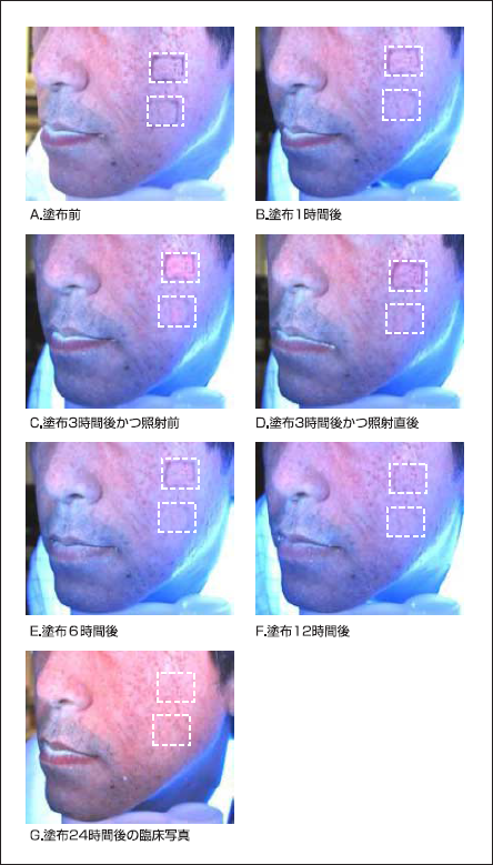 臨床的には、被験者3名とも塗布を開始して18〜24時間後(塗布終了15〜21時間後)に著明な紅斑が認められ、翌日以降も紅斑は残存した。その後、2名において紅斑は約10日後に消失したが、残りの1名においては30日後まで紅斑が遷延した(図4)。