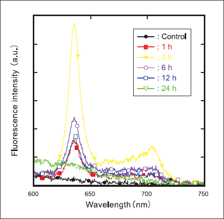 2wt%5—ALA外用薬を塗布した場合、塗布して1時間後から僅かな蛍光発光が確認され、3時間後(光照射前、塗布終了2時間後)では明らかな蛍光発光が確認された (図6)。また、塗布部からの蛍光スペクトルの測定では、塗布して1時間後から630nm近傍にポルフィリン系化合物由来の蛍光ピークが認められ、3時間後(塗布終了2時間後)ではピーク強度は増加した。しかしながら、光照射後は時間経過とともにピーク強度は減少し、塗布して24時間後(光照射21時間後)においては630nm付近に蛍光ピークは確認できなかった(図7)。したがって、2wt%5-ALA 外用薬を塗布した場合において、画像診断装置による蛍光発現の程度と蛍光スペクトルの経時的変化は、同様の傾向であった。20%wt5-ALA使用においても、1、3、6時間後に蛍光スペクトルを測定したが、1時間後から630nm 近傍に蛍光ピークが現れ、3および6時間後の方が強度は 高くなった(data not shown) 。