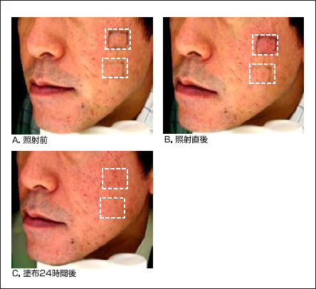 一方、臨床的には、2wt%5-ALAの場合には、光照射直後に外用薬を塗布した部位に軽微紅斑がみられたが、1時間後には軽快し、24時間後消退した(図8)。 0.5wt%5-ALAの場合には照射後の副作用はみられなかった。