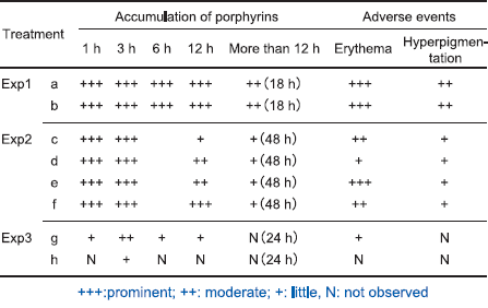 種々の濃度の5-アミノレブリン酸(5-ALA)を所定時間外用した際の、健常皮膚におけるポルフィリン系化合物の蓄積状態と有害事象について検証した。その結果、20wt%5-ALA外用薬を塗布した場合、正常皮膚に著しい紅斑、浮腫および炎症後色素沈着の発現が認められた。また、10wt%以下の5-ALA外用薬を塗布した場合、発赤および紅斑の発現は抑制され、特に2wt%以下の5-ALA外用薬では、紅斑は短時間で消失するかあるいは認められず、浮腫の発症はまったく認められなかった。低濃度5-ALAに有害事象の発現の抑制は、皮膚中のポルフィリン系化合物の集積の程度と関連があることが示唆された。