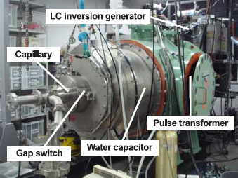 キャピラリーZピンチ放電型軟X線レーザー装置長さ10〜30cm程度、直径3mmのセラミック細管にガスを封入し、波高値10~30kA、パルス幅100ns程度の電流パルスによって生成した高温(70〜100eV) ・高密度(1018〜1019cm-3)Zピンチプラズマにより、軟X線レーザー発振を行う。 これまで、ネオン様アルゴンによる世界で2例目となる46.9nm のレーザー発振に成功し、現在は、水素様窒素による13.4nm の発振を目指して、装置の改良を行っている。