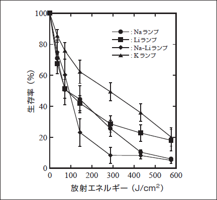 作製した放電ランプを用いて、皮膚科で主に用いられている光感受性物質である5-ALAを用いた癌細胞のinvitroにおける殺細胞実験を行った。その結果を図3に示す。図3の通り、Na-Liランプが最も高い殺癌細胞効果 を示した。(11)