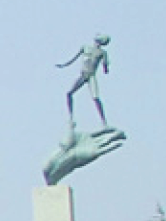 ミレスの神の手(下の写真の右端)高さ8mの白い角塔の上にある3.8mのブロンズ彫刻は20世紀最大の彫刻家カール・ミレス(Carl Milles 1875 - 1955 Sweden-USA)の晩年の傑作。天 空を仰ぎ見る青年の裸像が、力強く、しかしやさしさと慈愛を感じさせる左手に支えられている。九州大学医学部創立75周年記念で建てられた。