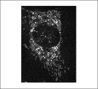 線状に薄く染色されているミトコンドリア上に粒子状に明るく見えるのがミトコンドリアDNA。