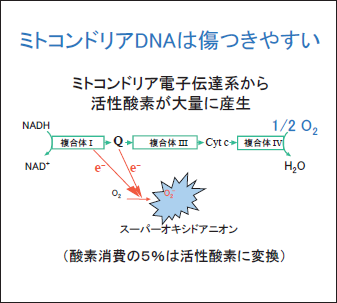 ミトコンドリアのDNAが傷つく原因として、ミトコンドリア自体の老化のほかに、ATP産生の際に発生する活性酸素の影響が大きいと指摘されている。