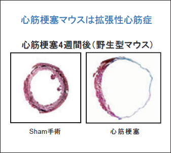 実験的に胸を開け、心臓の動脈を縛って心筋梗塞を起こすと、心臓は拡張(右)し、心不全に陥る。(Sham手術とは、胸だけを開けて動脈を縛らなかったもの)