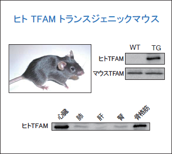 人間のTFAMを発現しているトランスジェニック(TG)マウスを作製(上)。このマウスは人間のTFAMを特に心臓で強く発現している(下図の左端)
