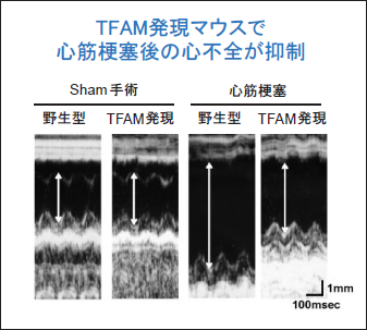 TFAMを発現しているマウスでは、心筋梗塞後も心臓の拡張が起こっていないことがわかる(右側の2つを比較)。