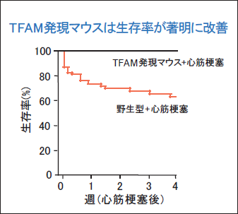 TFAMを発現しているマウスでは心不全が起こらないため、心筋梗塞後4週間たっても死亡しない。