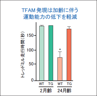 年をとったマウスも、TFAMを発現していると運動能力が保たれている(右、24月齢での比較)。
