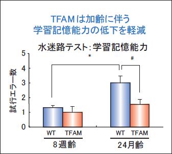 年をとったマウスも、TFAMを発現していると記憶能力が保たれている(右、24月齢つまり2歳での比較。マウスの寿命は3年から4年)。