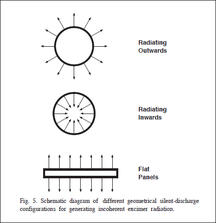 放電用ガスとして希ガス或いは希ガスとハロゲンガスの混合ガスを用いると、ガス種により色々の波長のエキシマ光を発光させることが可能である。現在主に市販されているものとしては、希ガスであるアルゴン(Ar)、クリプトン(Kr )、Xeを放電ガスに使った発光中心波長がそれぞれ、126nm、146nm、172nmのもの、これら希ガスと塩素(ハロゲン)の混合ガスを放電ガスに使ったKrCl*、XeCl*エキシマによる発光中心波長がそれぞれ、222nm、308nmのものがある。このようにエキシマの種類を選択することによって、VUV領域から可視光( VIS )領域に渡って、従来の放電ランプでは得られない波長の、比較的狭帯域のスペクトルが、高効率で得られている。