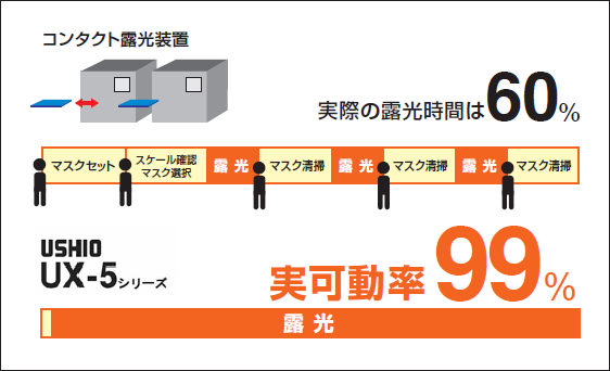 密着方式のマスク露光では無人化は不可能だったが、ステッパ技術及び、マスクペリクルを使用することでのマスク検査レス・メンテナンスレスを可能にし、露光ラインを無人化=クリーン化することを実現した。