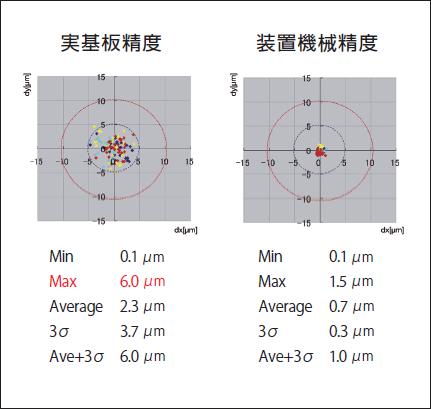 当社のパッケージ基板用ステッパ「UX-5シリーズ」は、L/S=8/8μm の解像性能(図2)、±6μm(図3)の総合重ね合せ性能および、135面/時間の高いスループットを有しており、最先端 FC-BGA の量産用として採用が加速している。