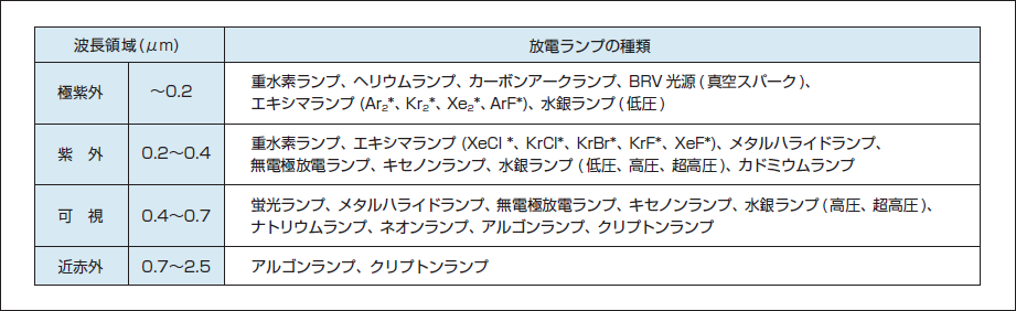 表2には、放射波長で大別した放電ランプの種類を示します。放電ランプは、気体放電により光を放出する現象を利用します。 放電管内に気体を充填し、電極間で加速された電子またはイオンが気体原子や分子と衝突して励起状態にし、これらが基底状態に戻るとき光を放出します。ランプの場合、放電を開始させそれを安定に維持する必要があり、図 1は放電開始からアーク放電として安定化するまでの電流と電圧の関係を示しています。放電を開始させるには、まず、放電管の陰極と陽極の間に放電開始電圧以上の電圧を印加します。放電管内に宇宙線、放射性同位元素の存在によるγ線、X線などで発生した電子が電界で加速され、気体原子に衝突して電離しイオンを作ります。これをα作用と言います。生成したイオンがなだれのように増加して陽極に達し微弱な電流として観測されるようになります(A)。1個の電子が電解方向に単位距離進む間に気体原子を電離する数αを電子の衝突電離係数といいます。α作用でできた正イオンは陰極前面に急峻な陰極降下をつくりこれにより加速された正イオンは陰極から二次電子を放出させます(B)。これをγ作用といいます。γ作用は準安定状態の原子や放電光による光電効果でも生じ、α作用とγ作用が十分大きいと放電は急速に成長して放電電流が増大してグロー放電に移行します (C → D)。この状態で直流抵抗を減らしていくと放電電流が増加して陰極が過熱され、熱電子放出が起こるようになり(E)、電圧は急激に低下してアーク放電に移行します(F)。