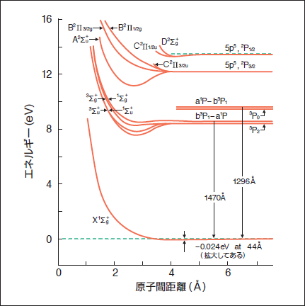 原子や分子からの光放射、または光吸収は、それらに帰属する電子がある状態から他の状態へ遷移することを基本原理にしています。スペクトルの中心周波数は、ボーアの関係で与えられ、粒子の置かれた状態によりスペクトルに周波数幅が生じます。その原因は、自然幅、ドプラー幅、衝突幅、Stark幅、などによります(線スペクトルの広がりについては後述します)。また、粒子の集合体の一部を放射体とした場合その周辺には吸収体が存在することになり、この粒子の集合体を外側から見たスペクトルは放射体自身のそれよりも減弱します。放射の減弱をできるだけ避けて封入した気体独特の強い原子線を得るために放電ガスの圧力を大気圧よりも低い10kPa以下にします。低圧放電プラズマからは電子の衝突や光の吸収によって励起された原子や分子が放出する線スペクトル、帯スペクトル、連続スペクトルが放射されます。図2には重水素ランプの放射スペクトルを示します。水素ガスの場合、水素原子の最もエネルギー準位が低いレベル間(スペクトルタームで表現すると、2P→1S)での遷移によりLymanα(121.567nm)と呼ばれる線スペクトルが放射します。これに水素分子からの放射が加わりVUV域のスペクトルを形成します。水素分子の基底状態はX1Σg+であり上のレベルで同じ多重度であるB1Σu+、C1Πuからの( 許容 )遷移によってLyman帯( B→X )、Wermer帯( C→X )と呼ばれる帯スペクトルが80~170nmに放射します。また、基底状態X1Σg+のすぐ上には反結合軌道である三重項b1Σu+があり、さらに高いところにはa3Σu+とc3Πuとがあり、このうち光学的遷移が許容されているa3Σg+→b1Σu+が紫外域から可視域にわたってなだらかな連続スペクトルを示します。250nmに最大値を示すこの連続スペクトルがあるので標準的な紫外光源として使われてきたわけです。